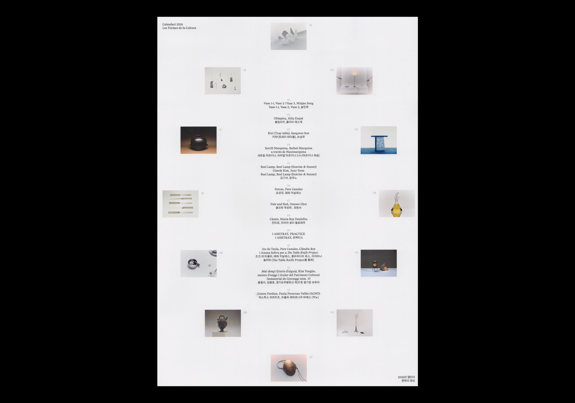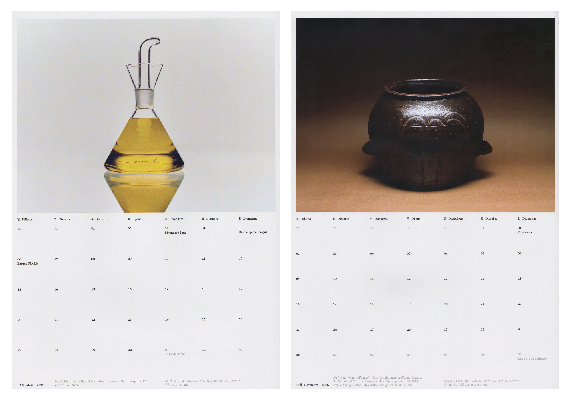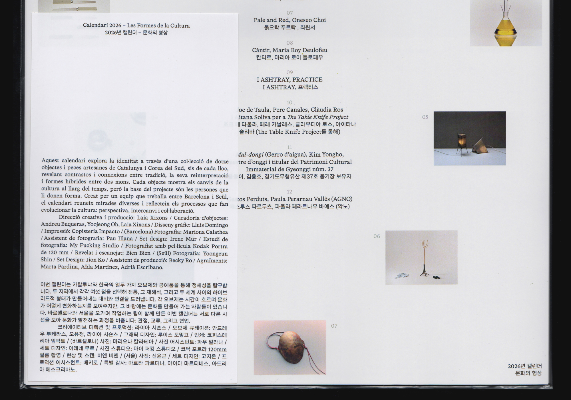 This calendar explores identity through a collection of objects and crafts from Catalonia and South Korea, six from each place, revealing contrasts and echoes across tradition, their reinterpretation, and hybrid forms between two worlds.