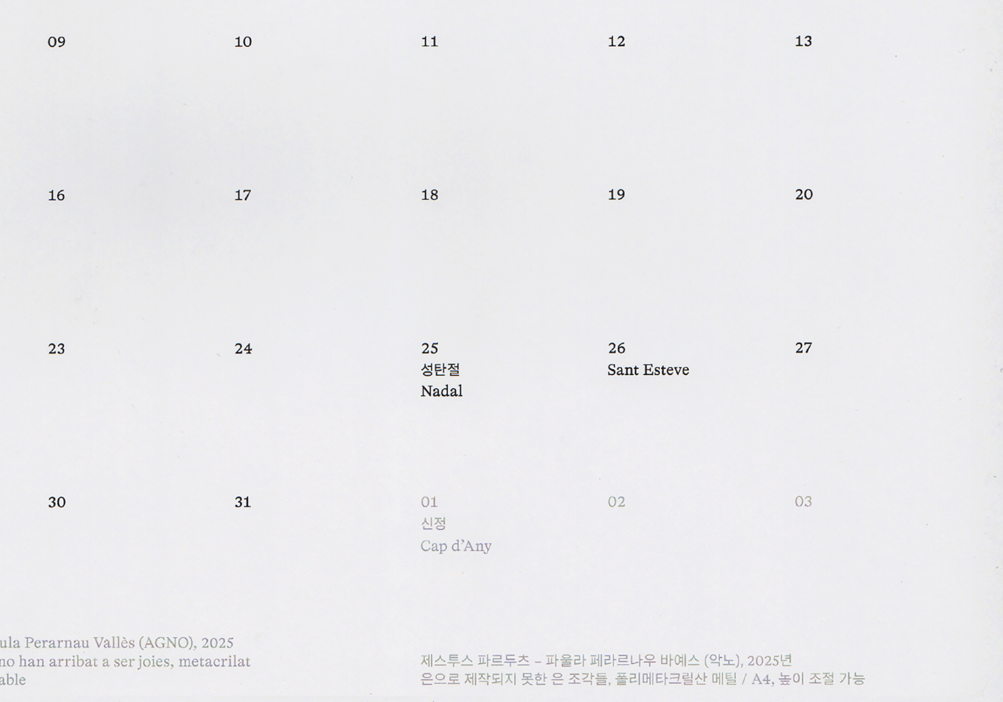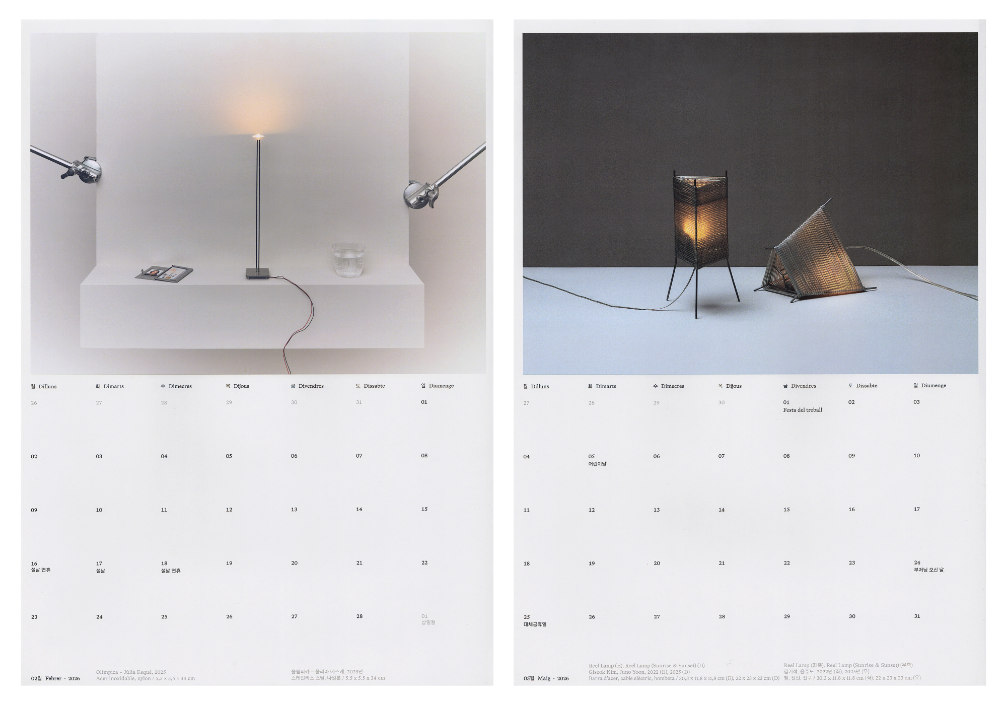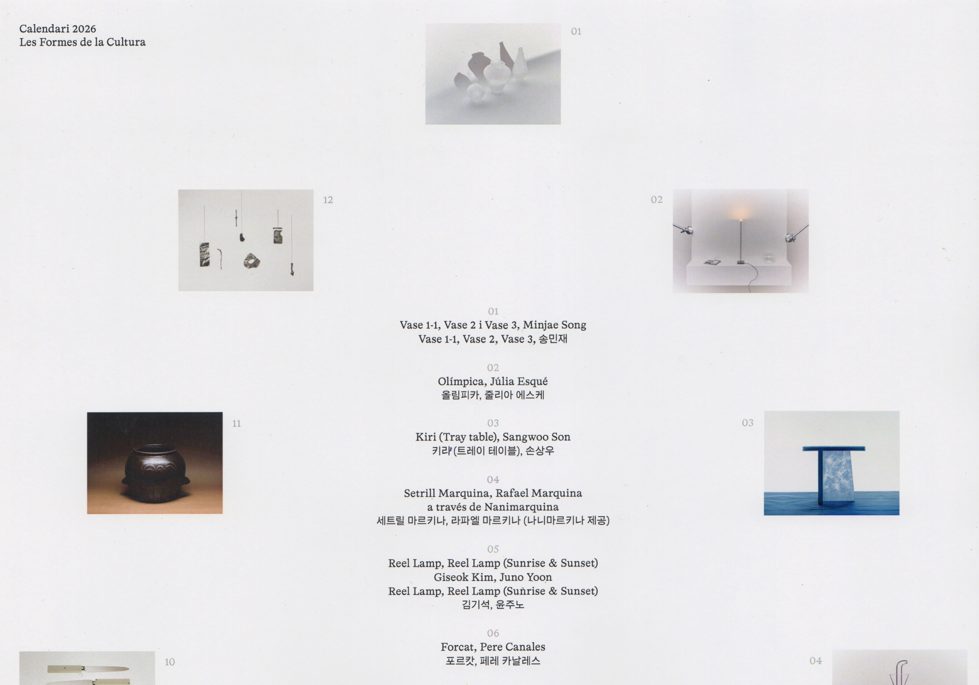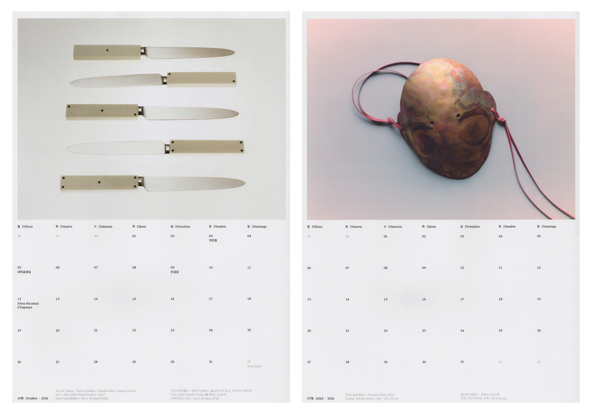 This calendar explores identity through a collection of objects and crafts from Catalonia and South Korea, six from each place, revealing contrasts and echoes across tradition, their reinterpretation, and hybrid forms between two worlds.